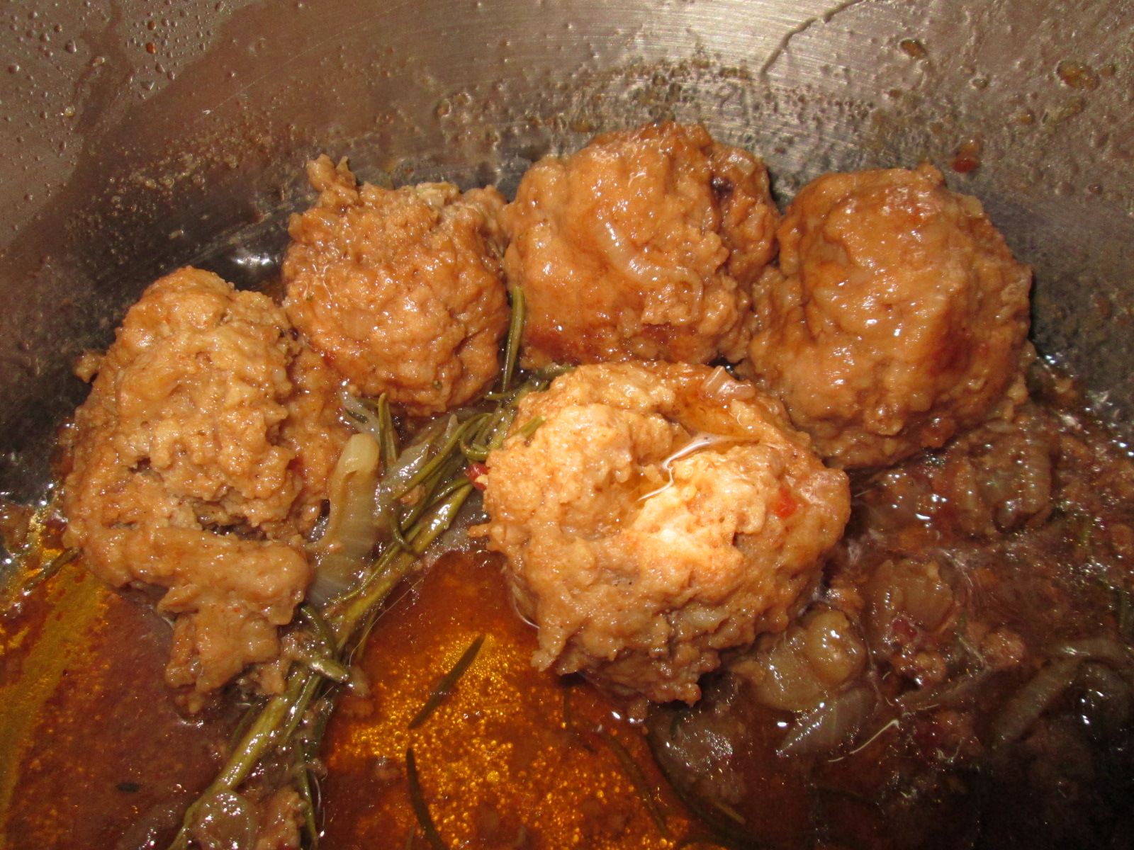Misturar muito bem a sopa de cebola o pão e a carne picada e fazer as bolas.