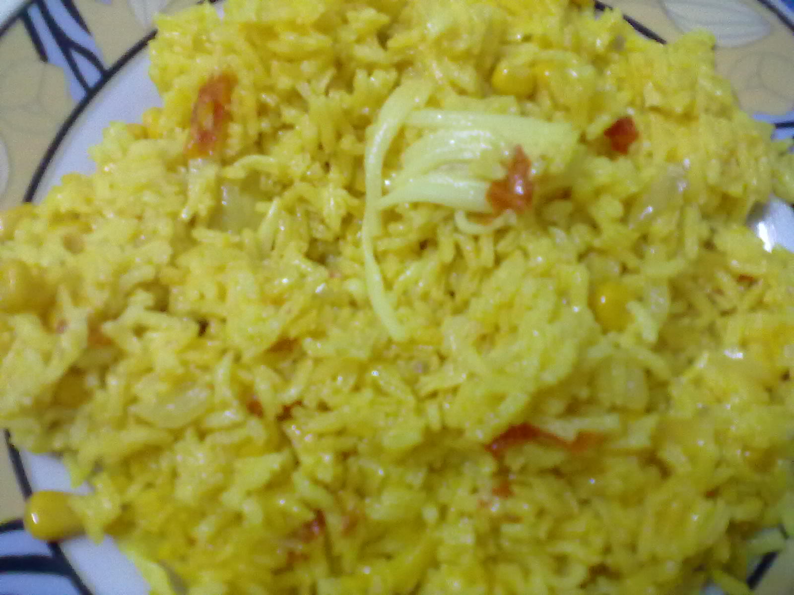 Depois o milho cozido, o arroz e o pó de açafrão e deixa-se estar um pouco.